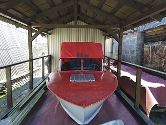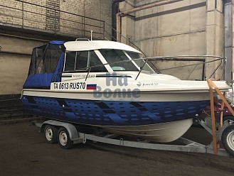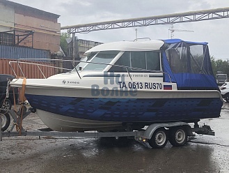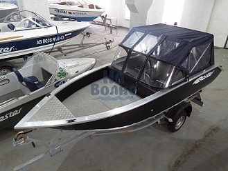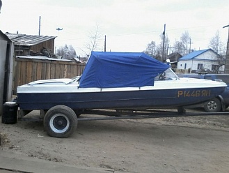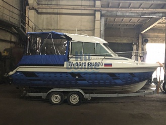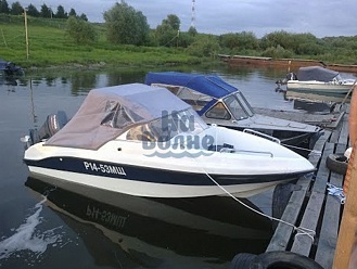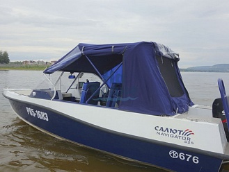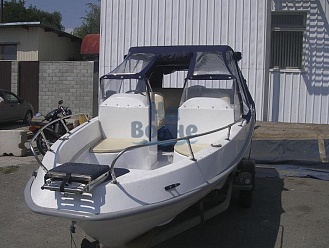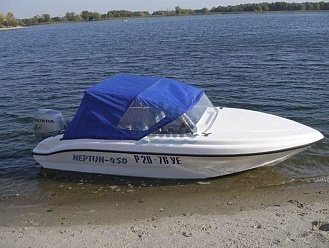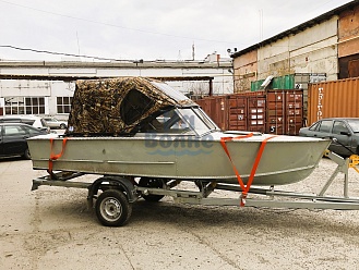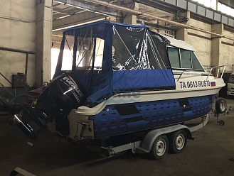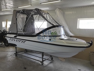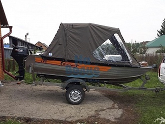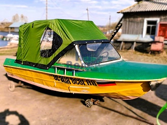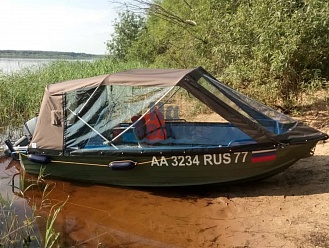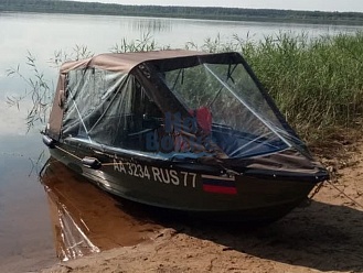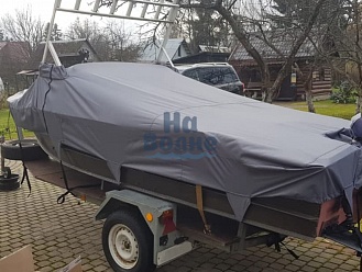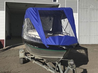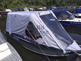 Тент с задней дверью для выхода к мотору, небольшими боковыми окнами и усиленными краями для установки застёжек. Изготовлен из специализированной тентовой ткани Оксфорд 600 повышенной плотности